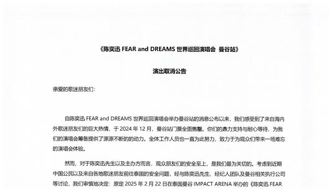考虑到近期前往泰国的安全问题,陈奕迅泰国曼谷演唱会取消